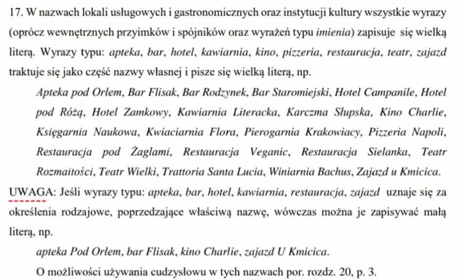 „UWAGA: Jeśli wyrazy typu: apteka, bar, hotel, kawiarnia, restauracja, zajazd uznaje się za określenia rodzajowe, poprzedzające właściwą nazwę, wówczas można je zapisywać małą literą, np. apteka Pod Orłem, bar Flisak, kino Charlie, zajazd U Kmicica”
